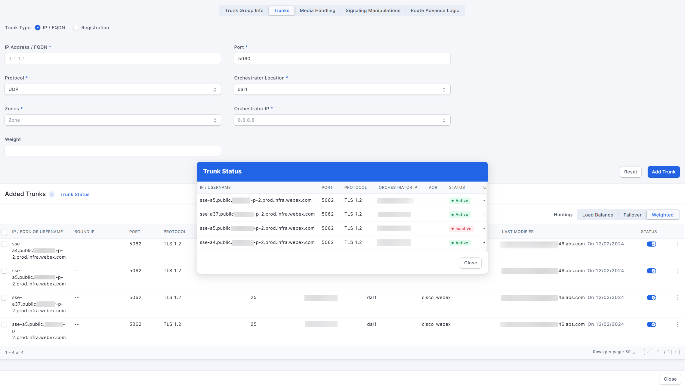 The PeerEdge Orchestrator supports username and password-based registration for SIP Trunks. For Origination Customer and Termination Vendor trunk groups, successful registration of a SIP Trunk results in an Address of Record (AOR) that can be used to route calls to. Terminating Customer and Origination Vendor trunk groups do not use the Address of Records (AORs).